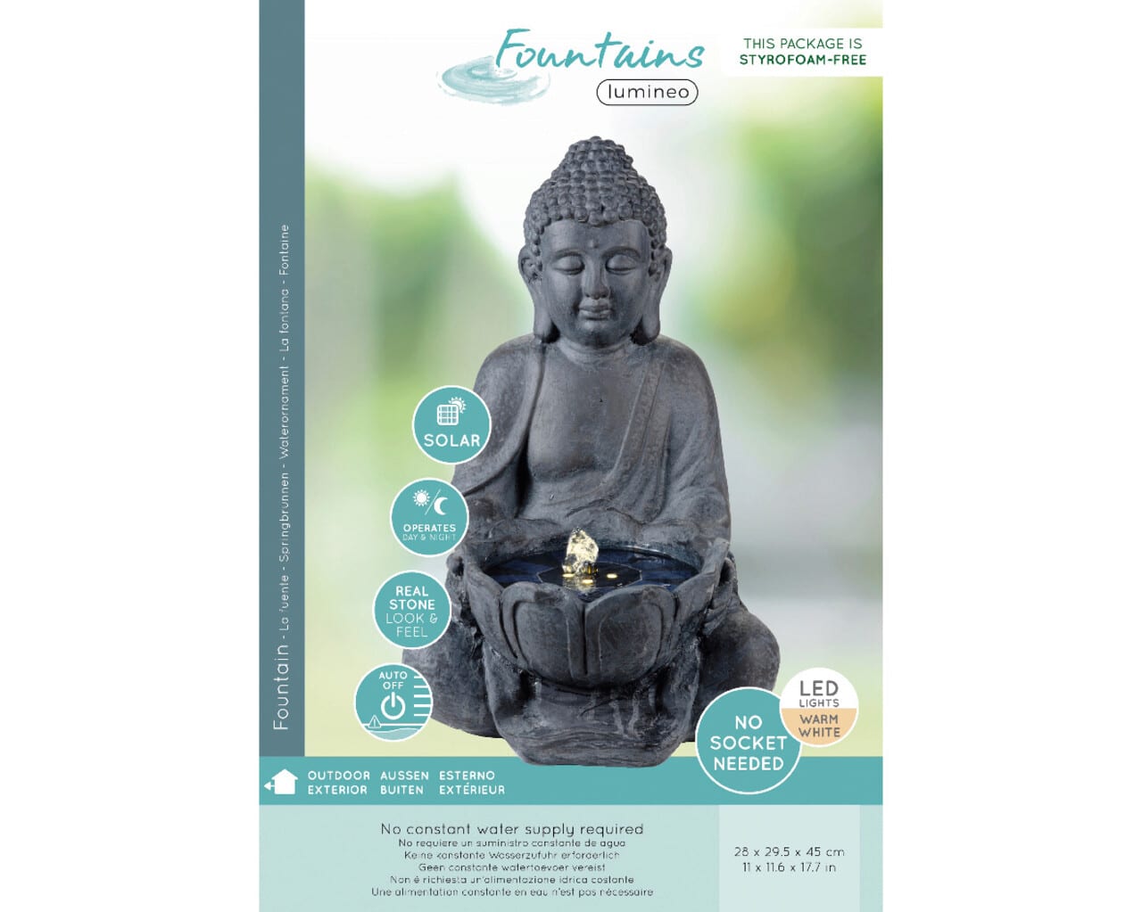 Fantana decorativa solara cu iluminare LED Buddha, Lumineo, pentru exterior, 28 x 29.5 x 45 cm, IP68, antracit/alb
