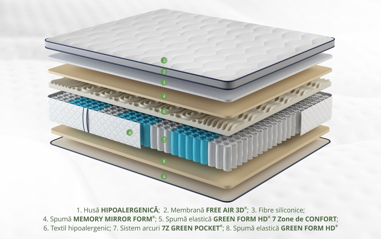 Sistemului 7Z Green Pocket® i se adauga spuma elastica Green Form HD® cu celulatie deschisa si 7 zone de confort ce asigura o pozitie naturala si corecta in timpul somnului, prevenind astfel durerile de spate sau cervicale. Husa Hipoalergenica din tricot de calitate superioara, moale la atingere, este matlasata cu fibre siliconice si 2 cm de spuma Memory Mirror Foam®. |