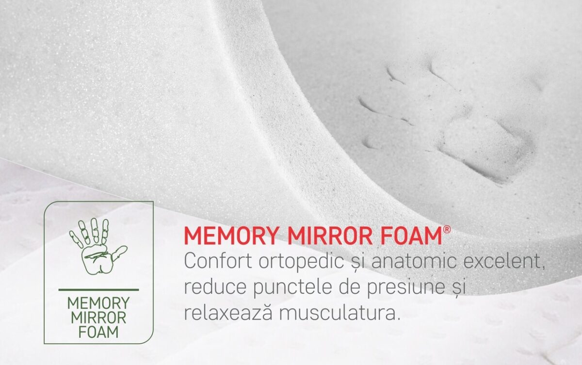 Stratul de 5 cm spuma Memory Mirror Form® reactioneaza la caldura corpului si se muleaza pe acesta eliminand punctele de presiune in timpul somnului pentru a relaxa muschii si a asigura o circulatie a sangelui corespunzatoare.