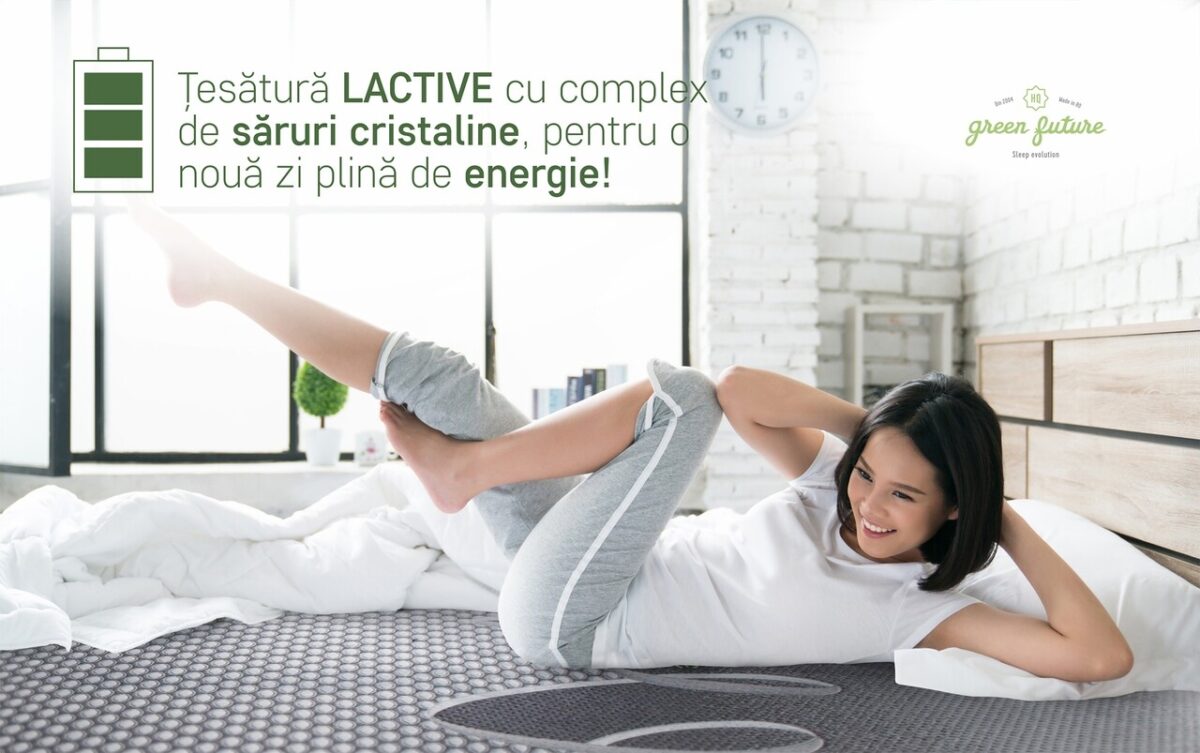 Tesatura saltelei este tratata cu LACTIVE®, un complex de saruri cristaline care actioneaza similar cu terapia cu ozon. Sarurile elibereaza in mediul inconjurator ioni activi care sunt inhalati si care determina cresterea nivelului de oxigen in sange. Efectul este diminuarea acidului lactic si eliminarea starii de oboseala. Somnul de calitatea superioara conduce la restabilirea echilibrului fizic si mental pentru o noua zi plina de energie.