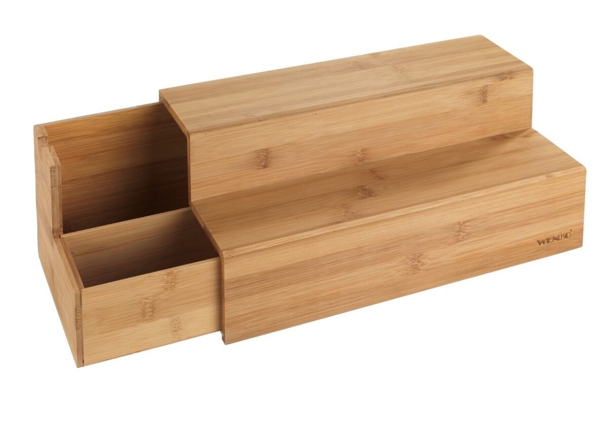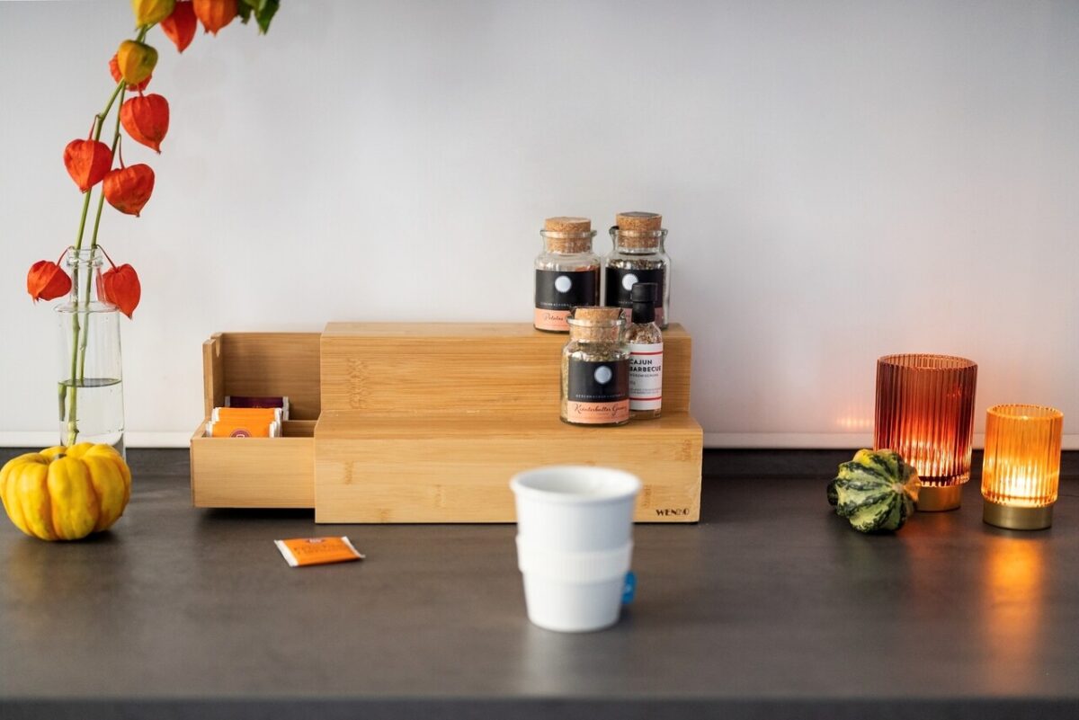 Suportul practic din bambus pentru cafea si ceai aduce ordine in dulapul din bucatarie sau blatul de lucru. Raftul de inalta calitate cu doua niveluri are un sertar pe ambele parti. Pliculetele de ceai sau capsulele de cafea pot fi pastrate ordonat si la vedere. Pe diferitele sale niveluri, organizatorul de bucatarie ofera un loc decorativ pentru a pastra cani, condimente si alte accesorii.